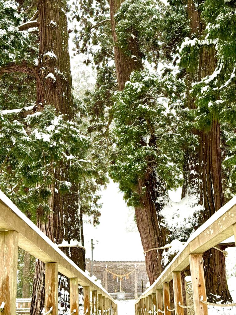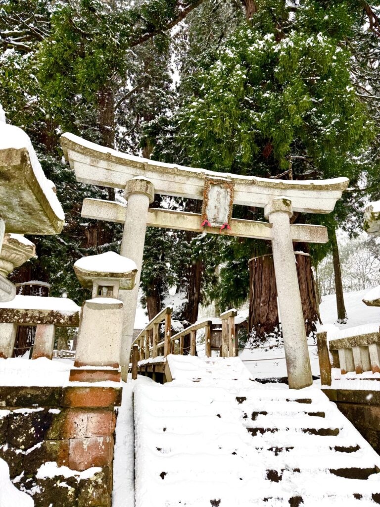 雪を纏った石造りの鳥居の向こうには、樹齢2300年とも言われる巨木がそびえ立ち、その神聖な空気に思わず背筋が伸びます。根元を保護するための桟橋も雪で真っ白。静寂の中で自然のエネルギーをチャージできる、最強のパワースポットでした。